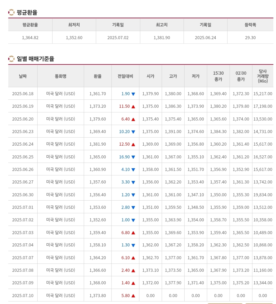2025년 7월 10일 환율 분석: 기준금리 동결과 외국인 매수세에 환율 하락…1370.0원 마감