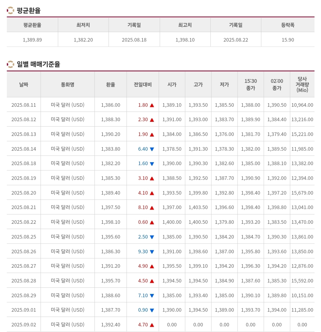 최근 환율은 1,389원 ~ 1,395원 구간에서 등락을 반복하고 있습니다. 9월 2일 외국인 매수세에 의해 환율이 하락했지만, 이번 주 발표 예정인 미국 고용지표 결과에 따라 다시 변동성이 커질 가능성이 큽니다.