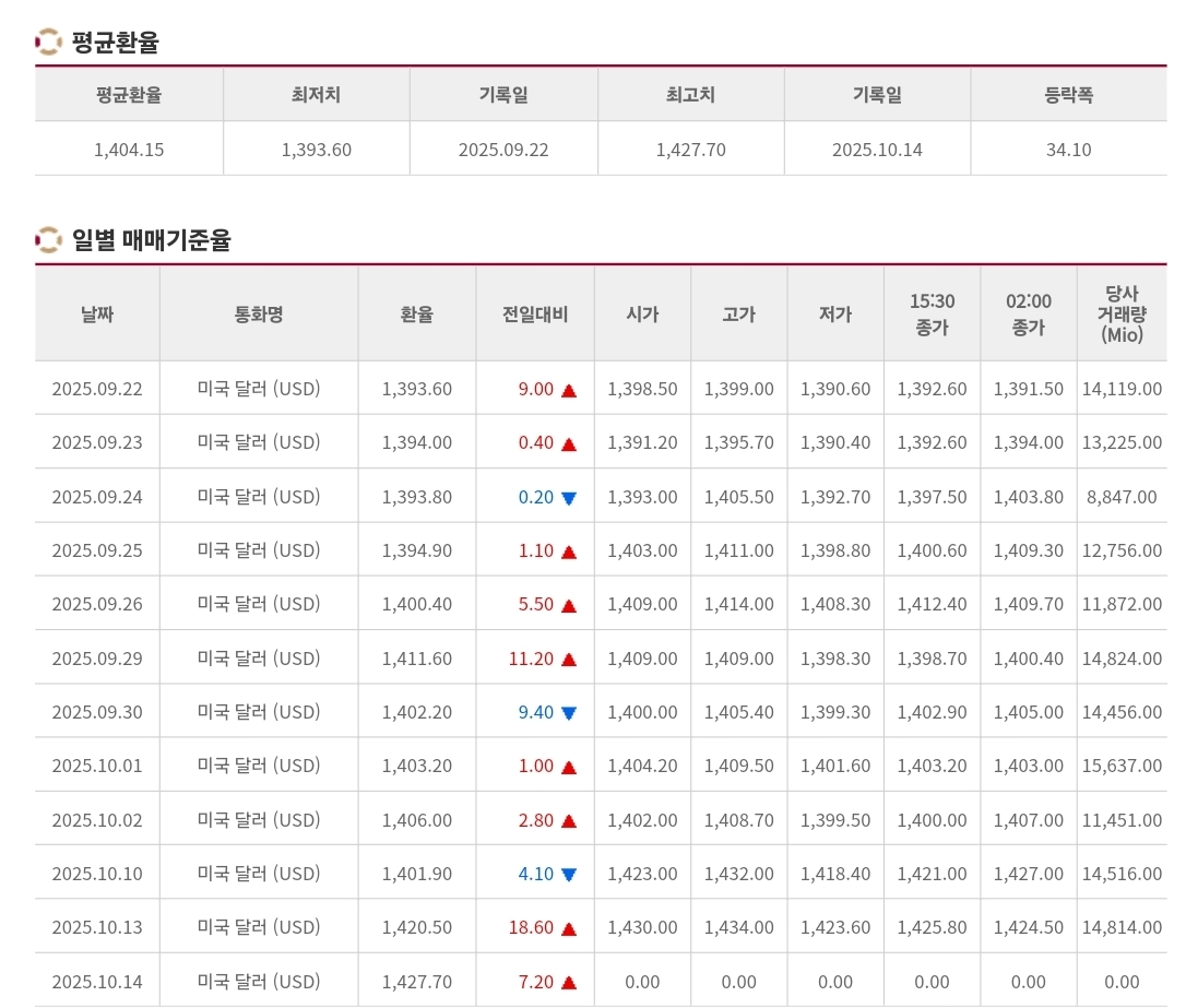 💱 2025년 10월 14일 환율 및 매매기준율 — 외환당국 개입에도 1,430원 재돌파
