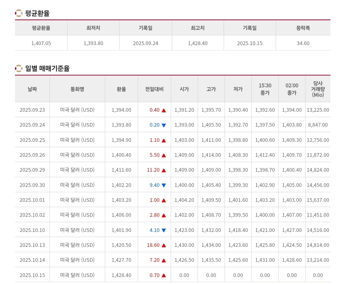2025년 10월 15일 환율 및 매매기준율 분석 – 한미 관세 협상 기대감 속 원·달러 환율 1,420원대 초반까지 하락