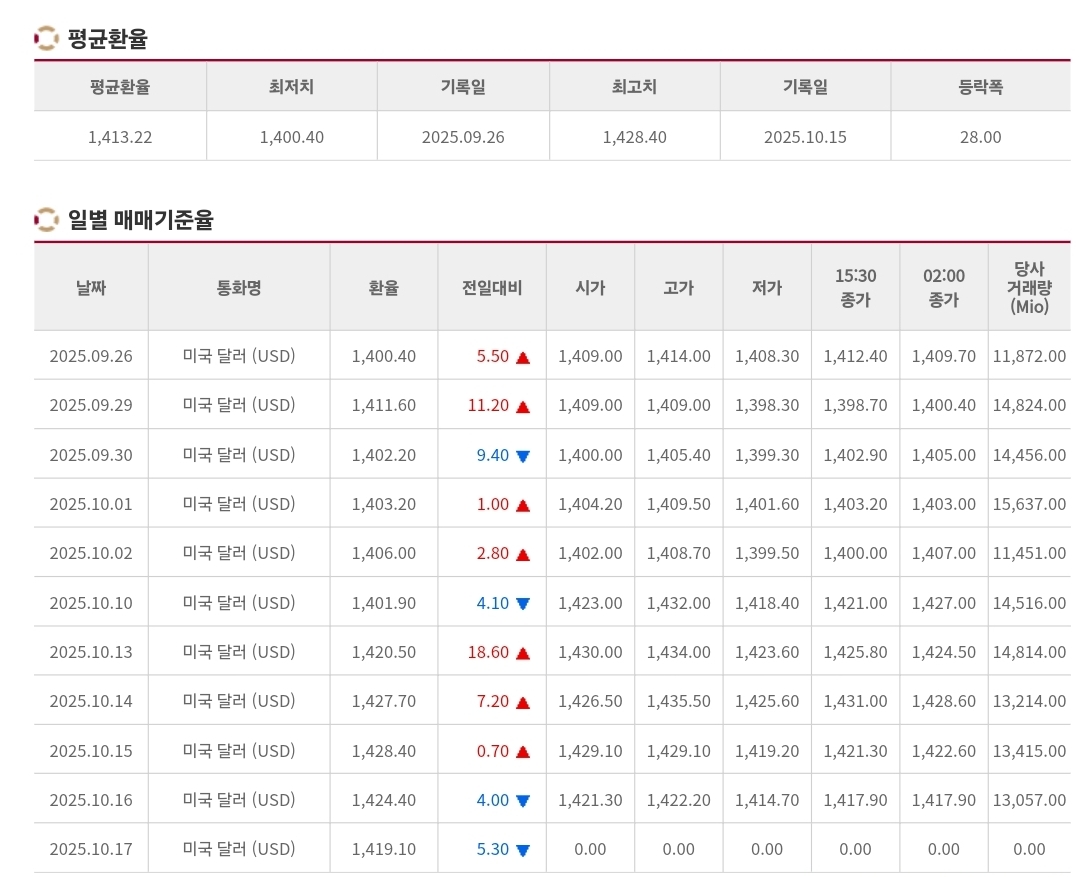 2025년 10월 17일 환율 및 매매기준율 분석 — 한미 무역협상 막판 조율 속 원·달러 환율 1,420원대 상승세