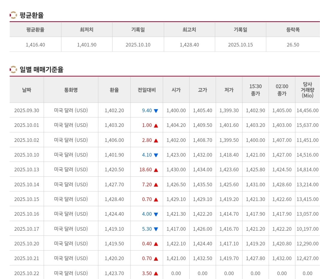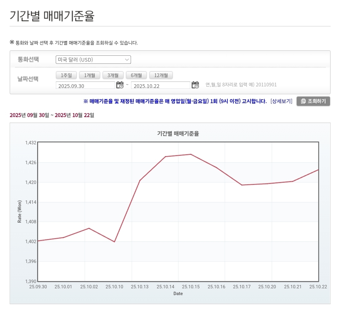💹 2025년 10월 22일 환율 및 매매기준율 — 미중 긴장 고조와 북한 미사일 발사 여파로 1,430원 돌파
