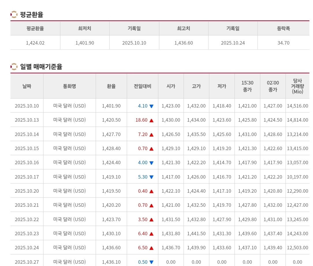 | 2025년 10월 28일 원·달러 환율 — 외국인 대규모 순매도와 정상회담 앞둔 관망세 속 상승 마감 (0) | 2025.10.28 |