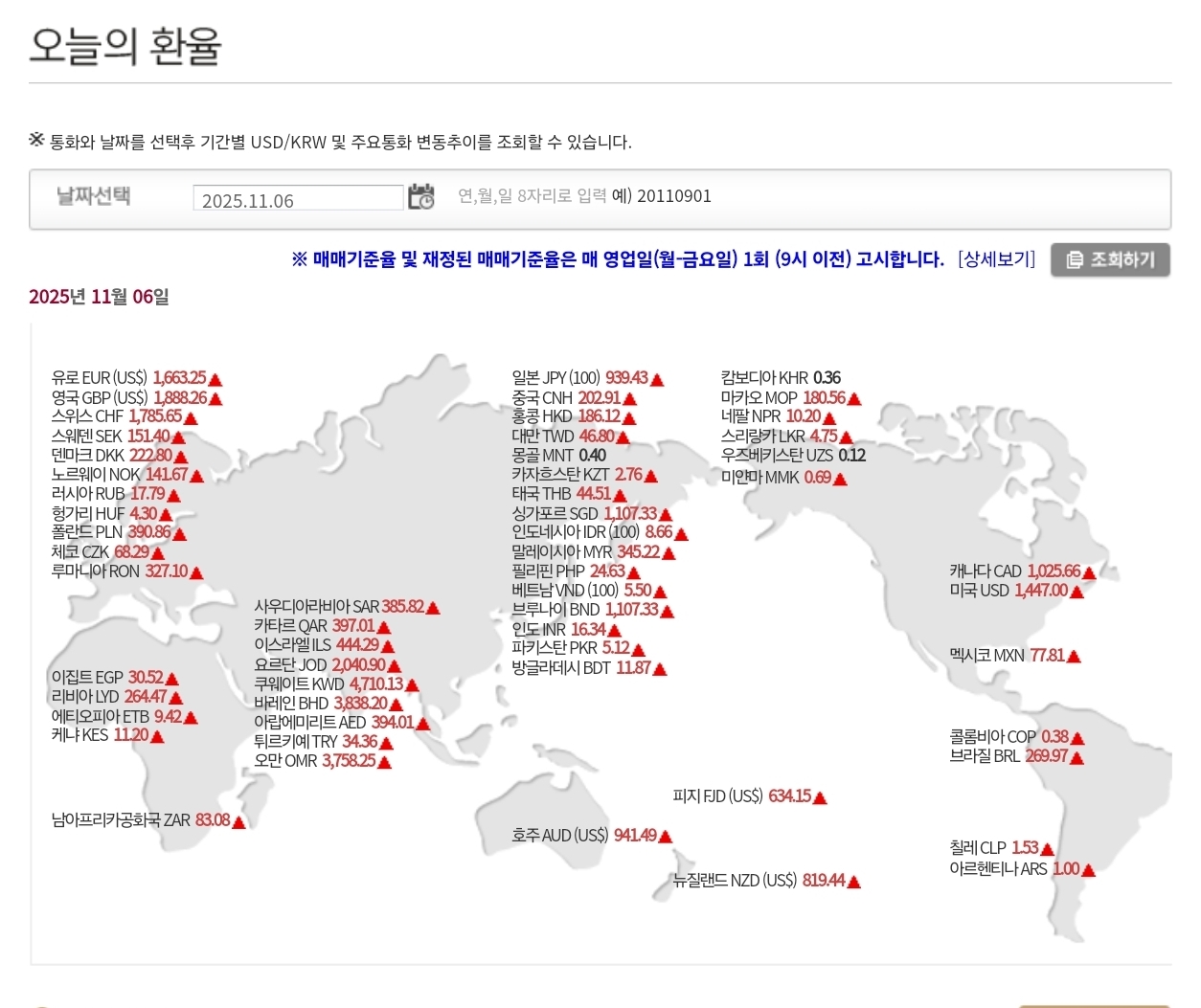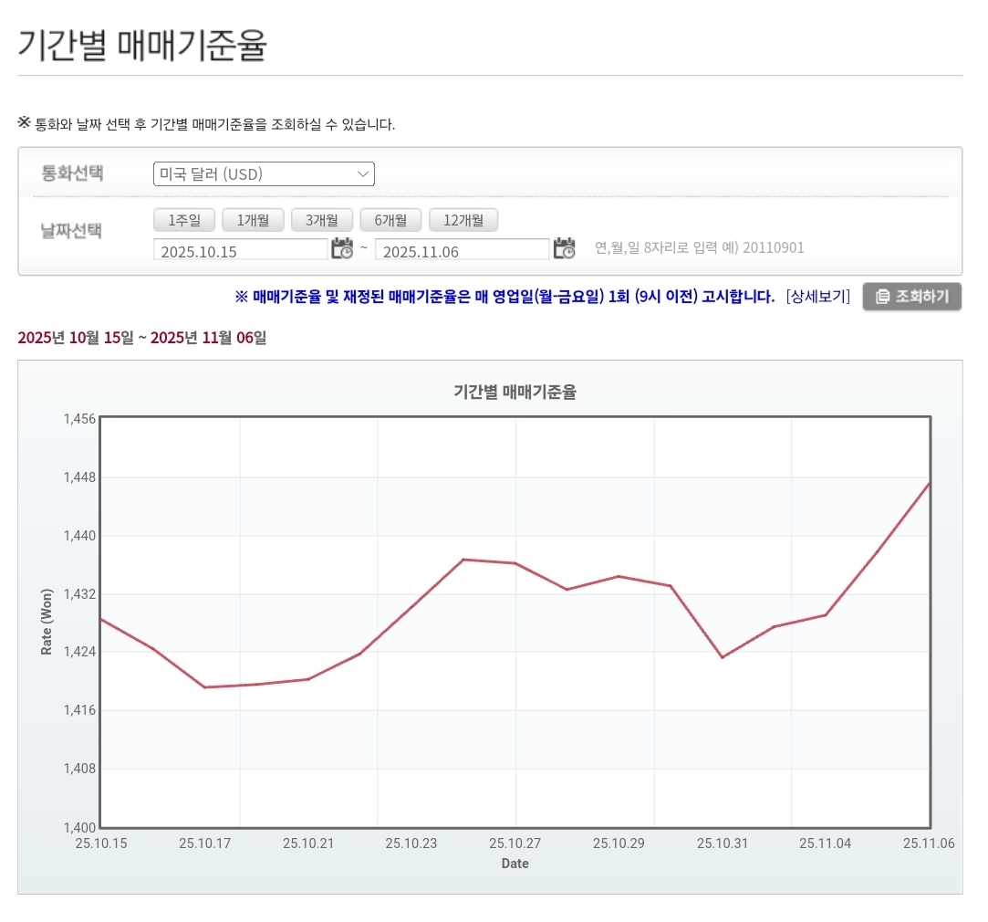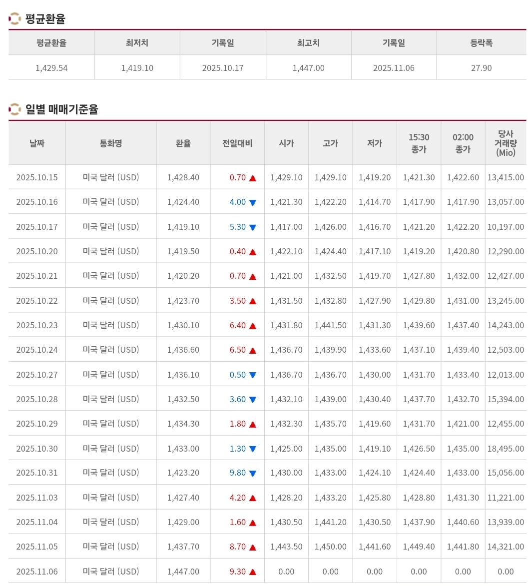 | 💱 2025년 11월 7일 환율 및 매매기준율 분석 — 외국인 순매도와 글로벌 불안 심리에 원·달러 환율 1,450원대 후반까지 상승 (1) | 2025.11.07 |