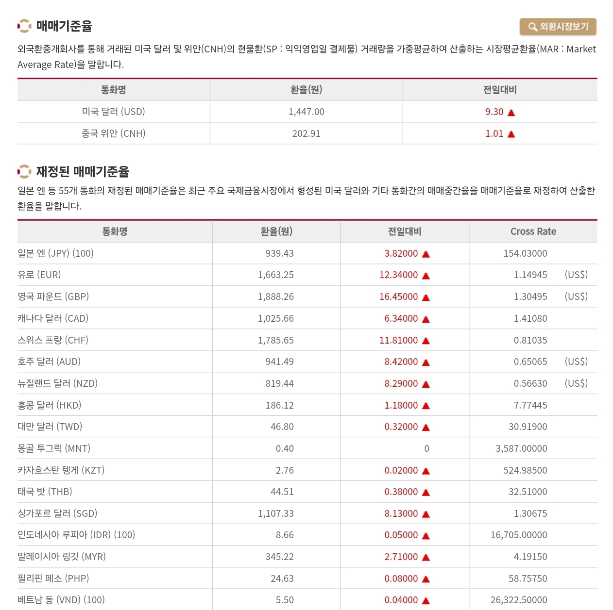 | 📈 2025년 11월 4일 환율 및 매매기준율 — 외국인 ‘2조 순매도’ 충격에 원/달러 환율 1,440원 돌파 (0) | 2025.11.04 |