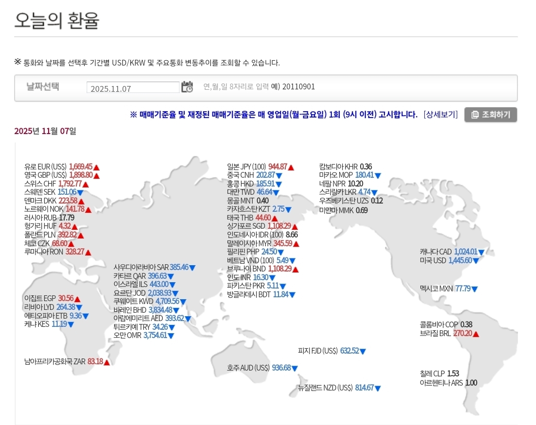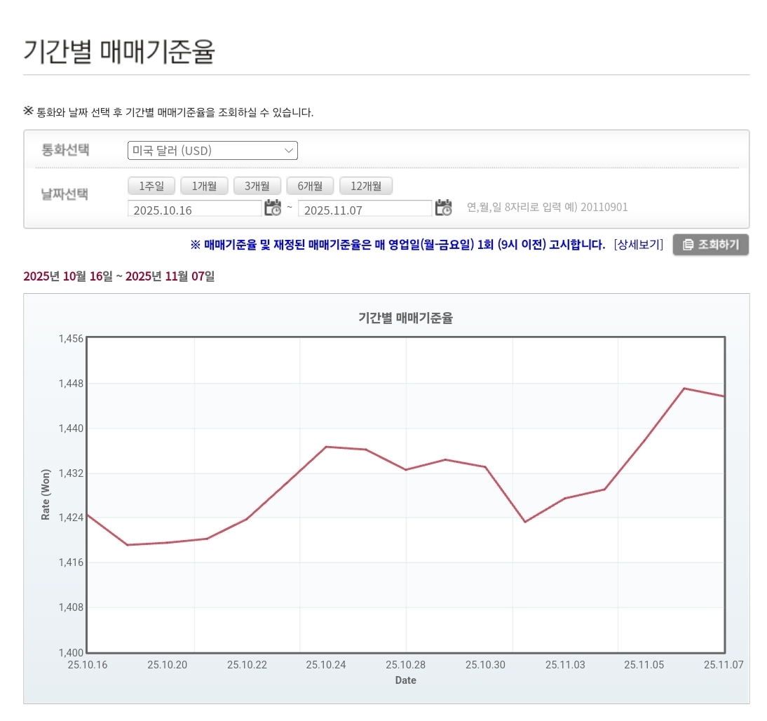 💱 2025년 11월 7일 환율 및 매매기준율 분석 — 외국인 순매도와 글로벌 불안 심리에 원·달러 환율 1,450원대 후반까지 상승 본문