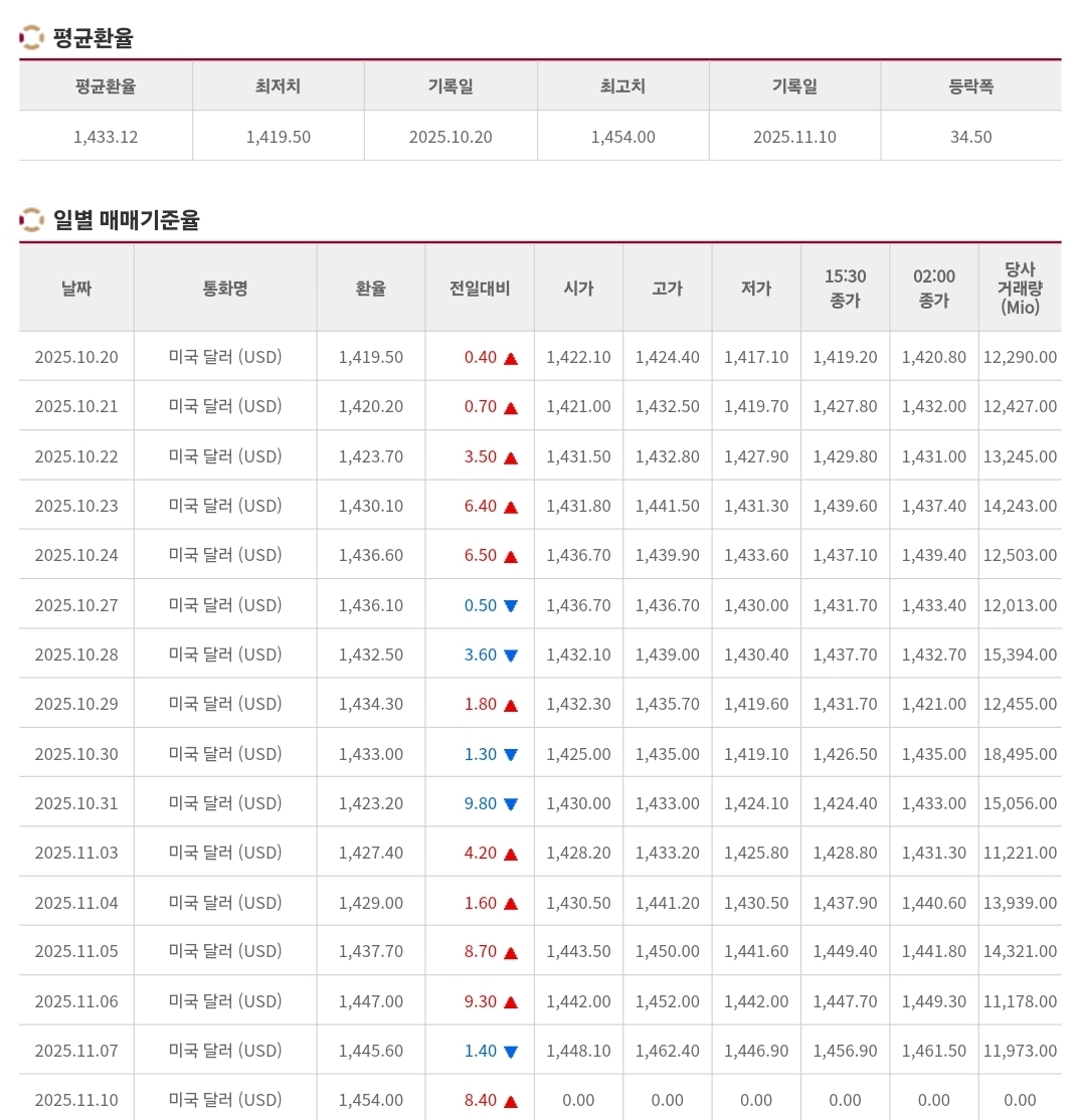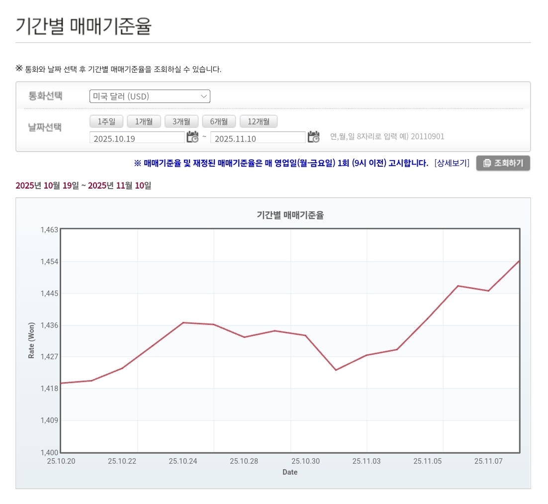 | 💱 2025년 11월 7일 환율 및 매매기준율 분석 — 외국인 순매도와 글로벌 불안 심리에 원·달러 환율 1,450원대 후반까지 상승 (1) | 2025.11.07 |