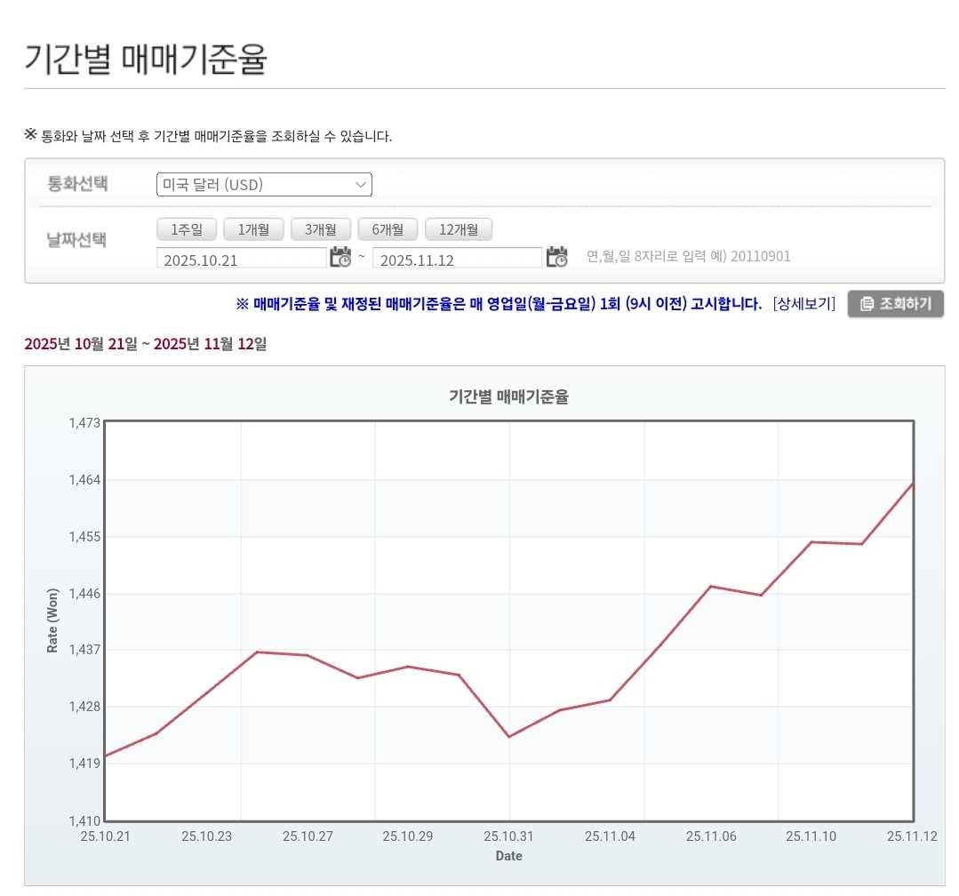 2025년 11월 12일 환율 및 매매기준율 1,470원 터치 — 7개월 만의 최고치 기록 본문