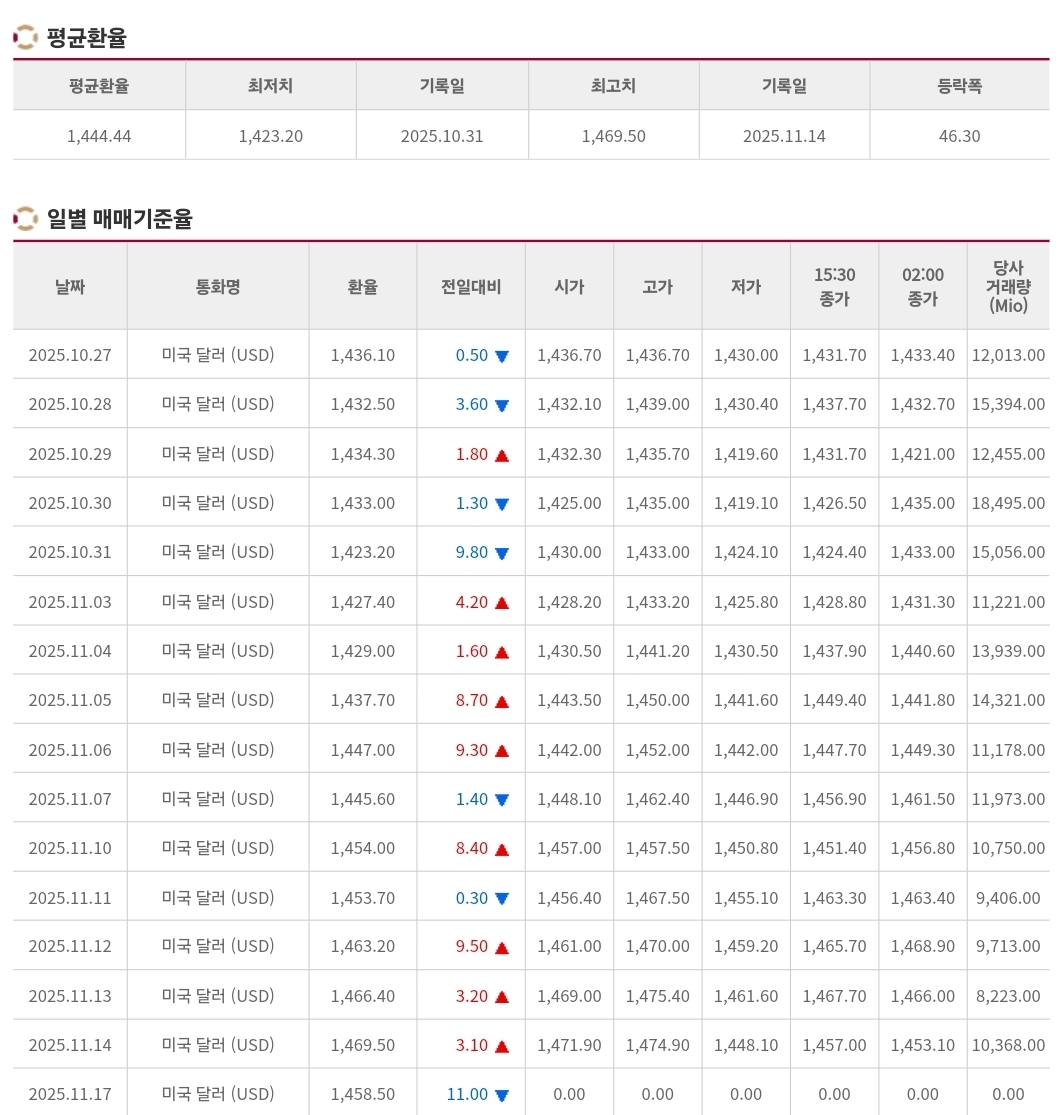 | 2025년 11월 13일 환율 및 매매기준율, 📈 1,475원 돌파 — 7개월 만의 최고치 경신 (0) | 2025.11.13 |