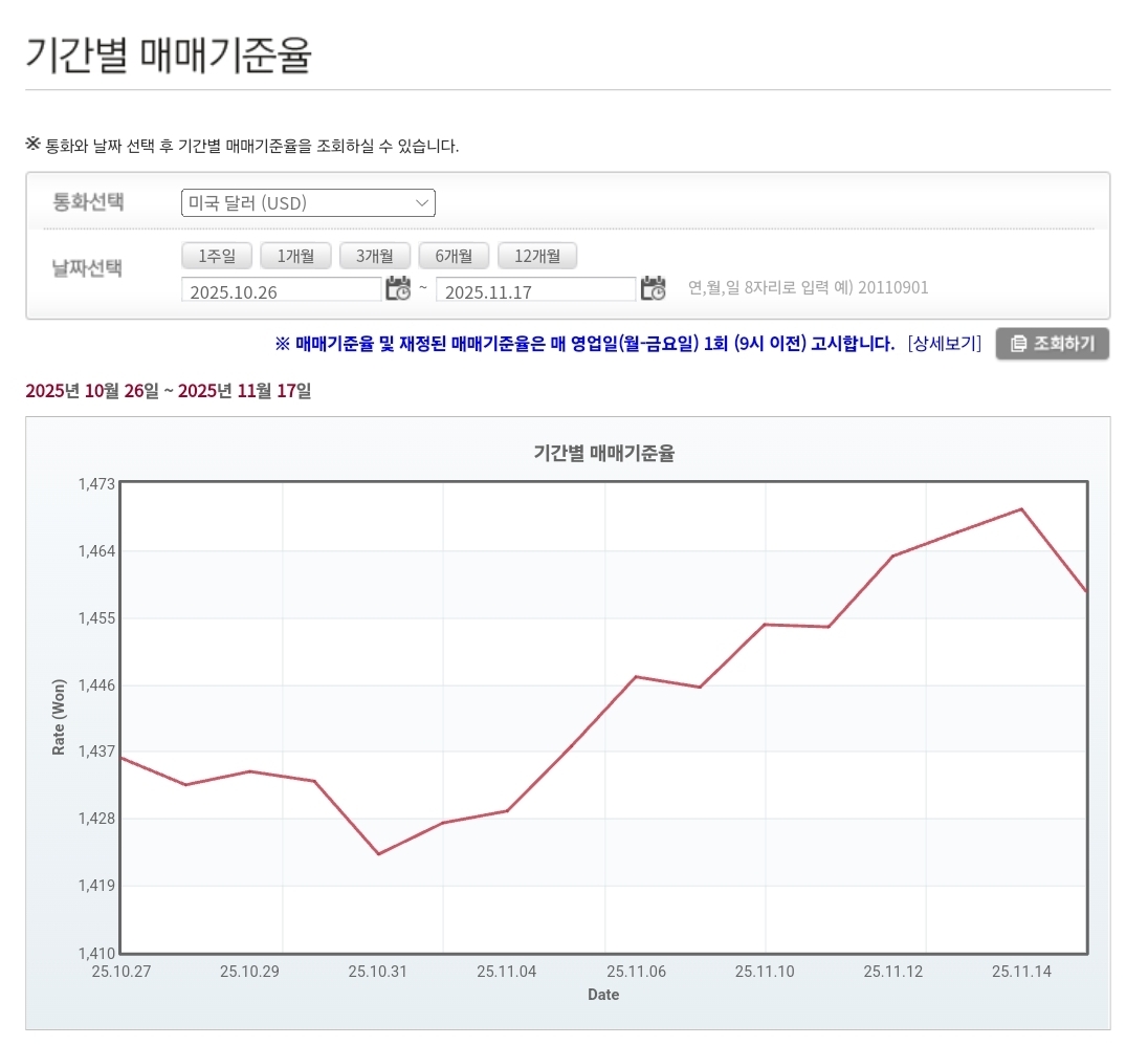 | 2025년 11월 12일 환율 및 매매기준율 1,470원 터치 — 7개월 만의 최고치 기록 (0) | 2025.11.12 |