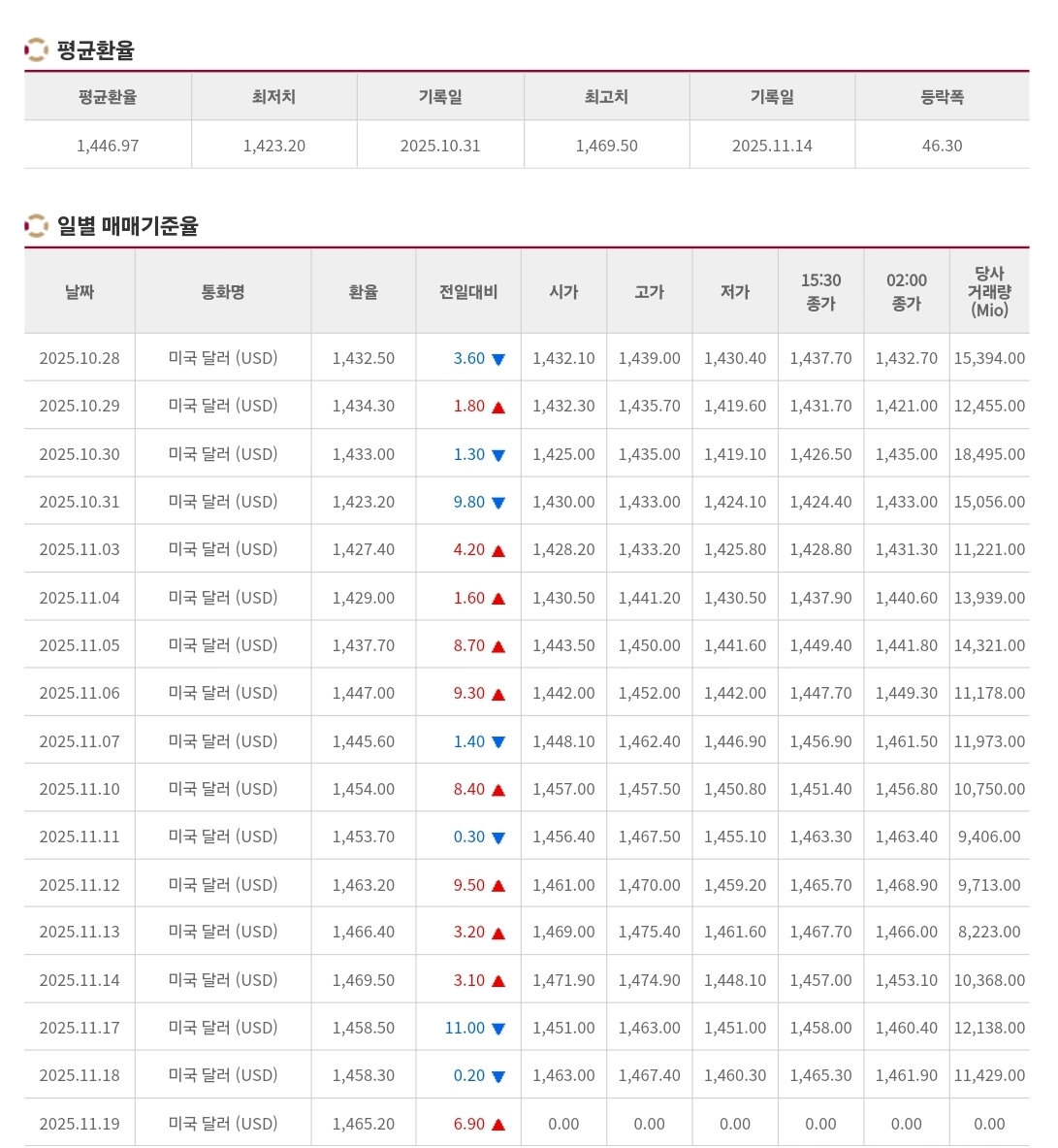 | 📈 2025년 11월 20일 원·달러 환율·매매기준율 분석 — 1470원 턱밑까지 치솟은 원화 약세 흐름 (1) | 2025.11.20 |