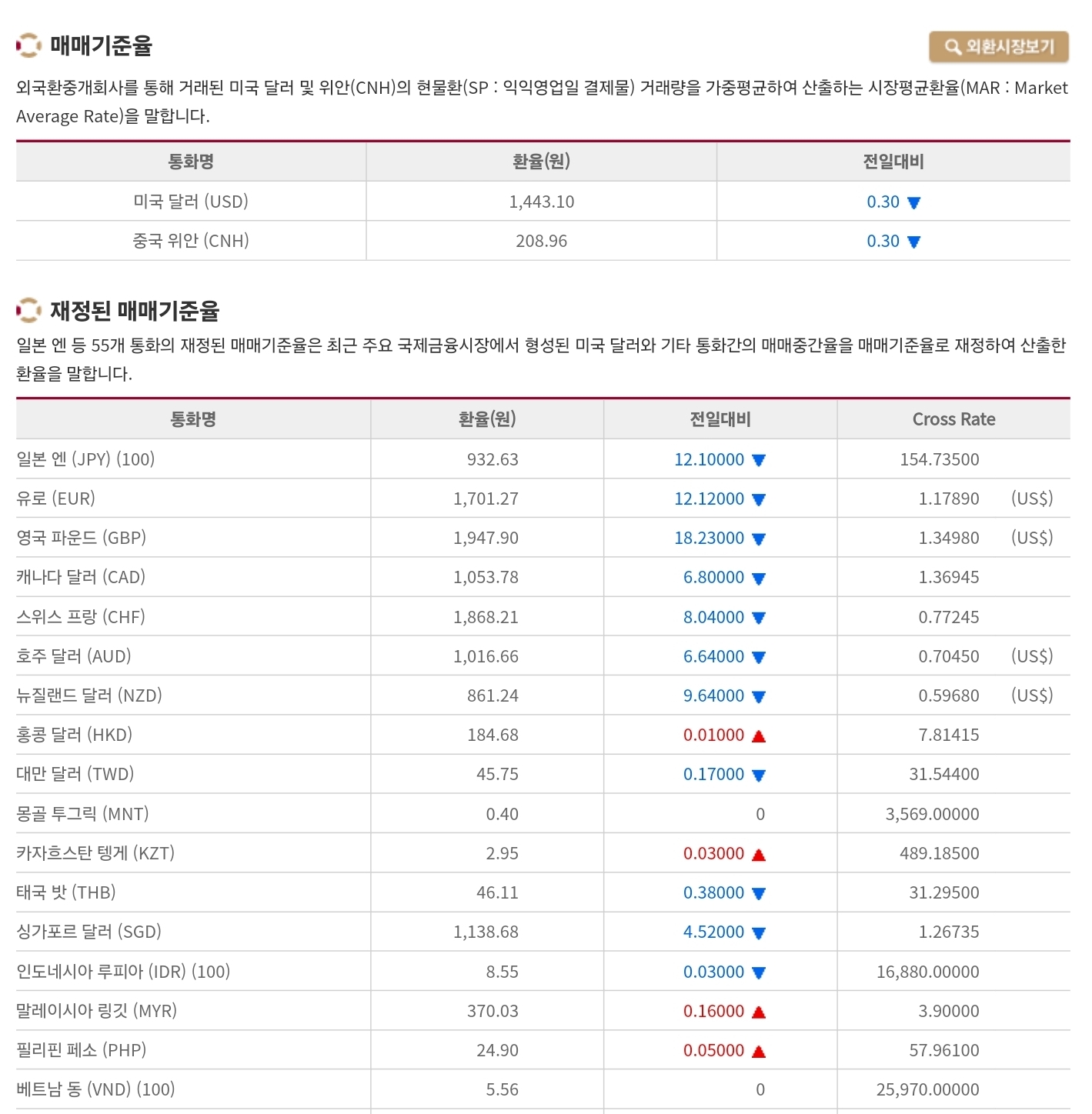 매매기준율은 은행이 외화를 사고팔 때 기준이 되는 환율입니다. 여기에 환전 스프레드가 붙습니다.