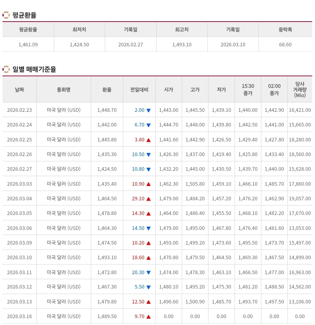 2026년 3월 16일 국내 외환시장에서 원/달러 환율이 또다시 상승하며 1,490원 후반대까지 올라섰습니다. 특히 이날 환율은 장중 1,500원을 돌파하면서 글로벌 금융위기 이후 가장 높은 수준을 기록했습니다.