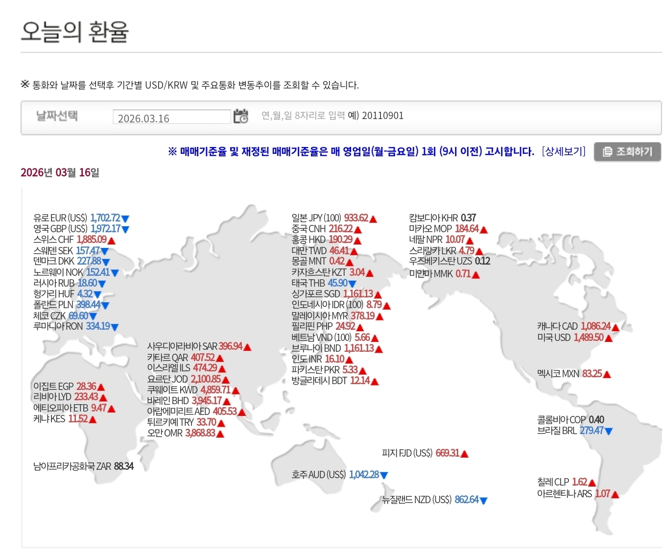 이번 글에서는 2026년 3월 16일 환율 흐름과 매매기준율, 국제유가 상황, 달러 인덱스 변화, 코스피 시장 흐름, 외국인 자금 움직임, 향후 환율 전망까지 자세히 정리해 보겠습니다.