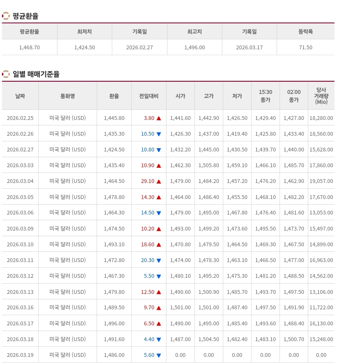 2026년 3월 19일 외환시장에서 원달러 환율은 1,501.0원으로 금융위기 이후 처음 1,500원대를 돌파했습니다.